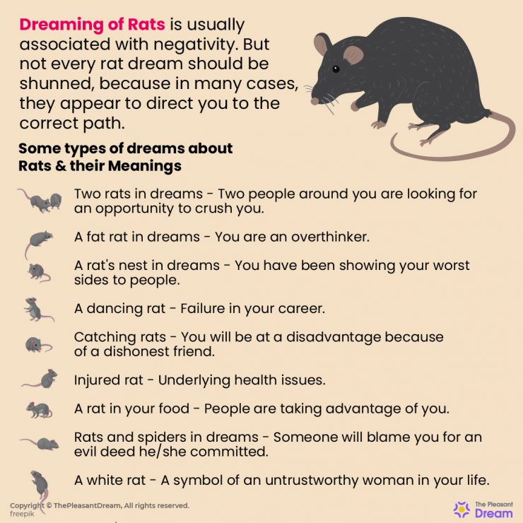 If you dream of a rat infestation it’s important to take action to rid your home of the pests. On the other hand, dreams about rats and mice can have a positive interpretation. The rat is a symbol of stealing, lying, and backstabbing other people.