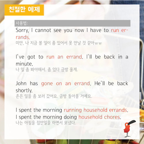 Examples i have been running errands all day today and i am so tired! So, an errand is basically a task or an assignment, something that you need to do outside of the house.